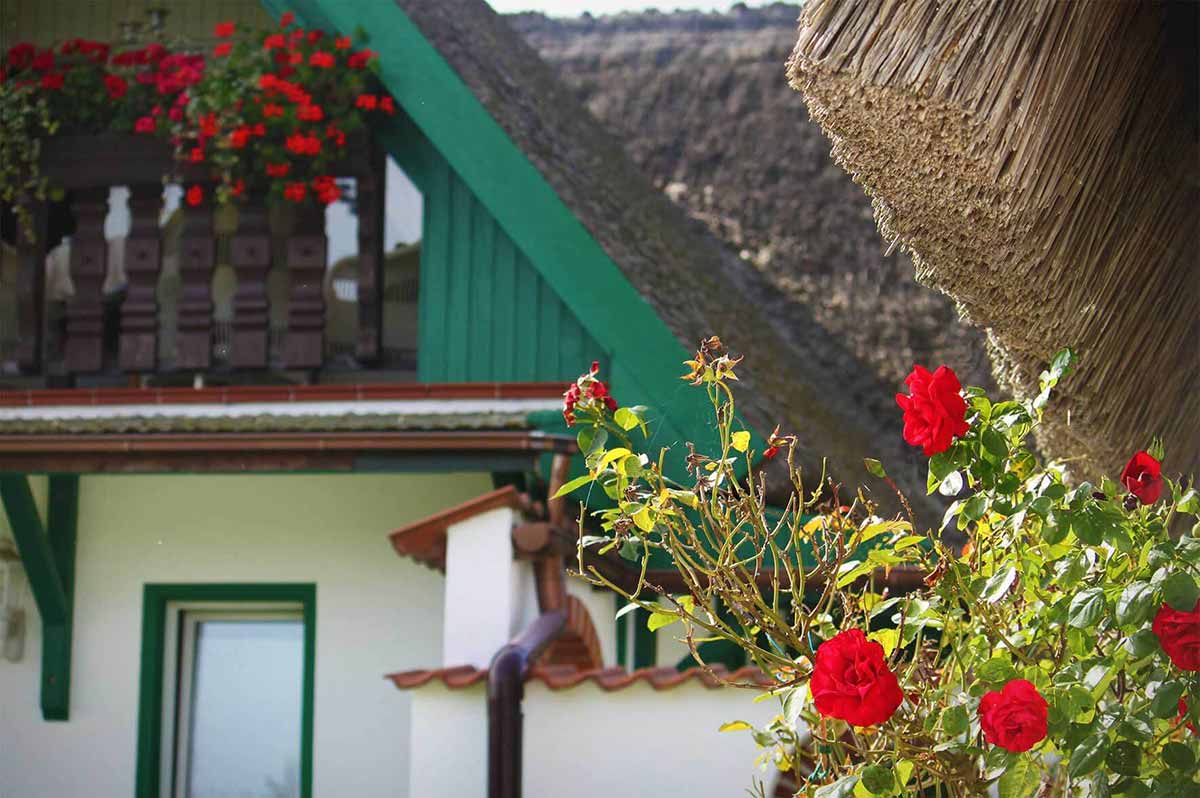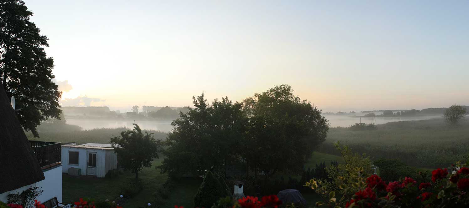 Der Ausblick ist atemberaubend, wenn die aufgehende Sonne das Wasser des angrenzenden Boddengewässers in flüssiges Gold verwandelt. Da stellt man den Wecker auch schon mal etwas früher ein, um das ein weiteres mal zu erleben…